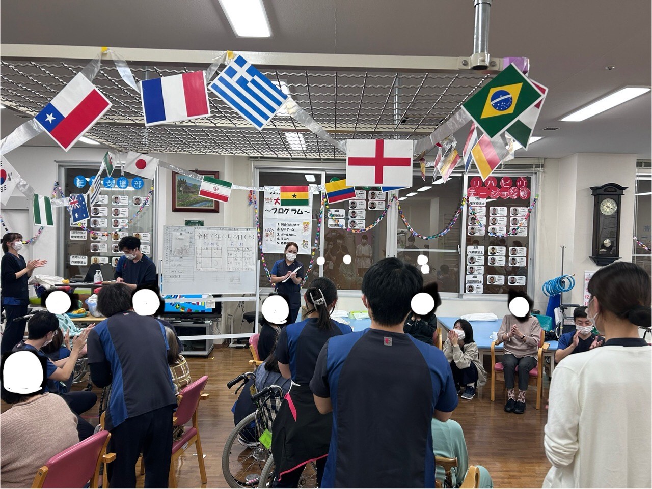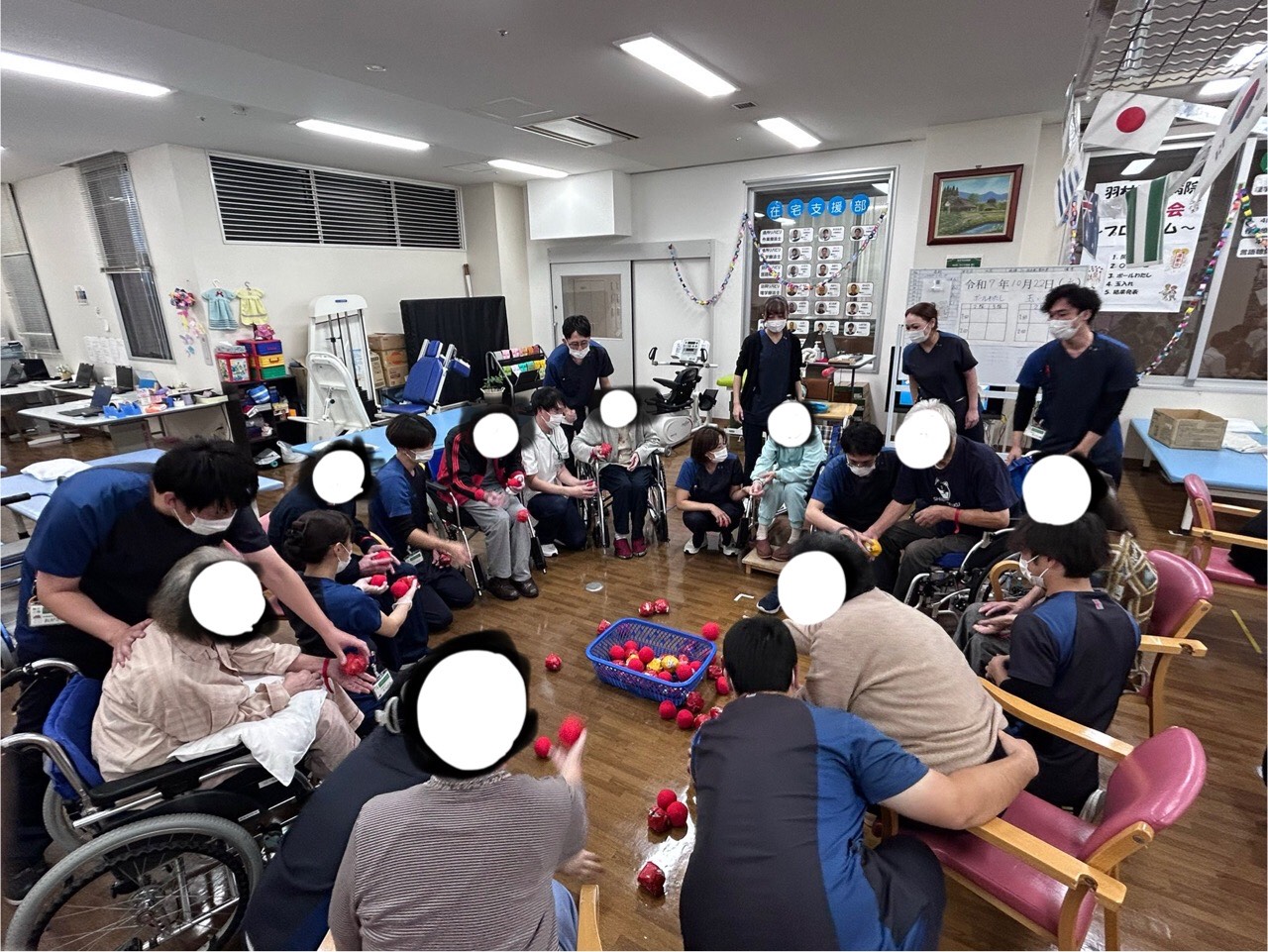 各階ごとにチームを分けて「〇✕クイズ」「ボール渡し」「玉入れ」の3つの競技を行いました。季節に合わせた活動を行うことで、見当識の向上や活動に対するモチベーションの向上へと繋がります。普段と異なる活動によって、普段では見られない一面がみられ、患者様同士で交流を楽しんでいただけました。各競技で白熱した勝負となり、大盛り上がりで幕を閉じました!!
